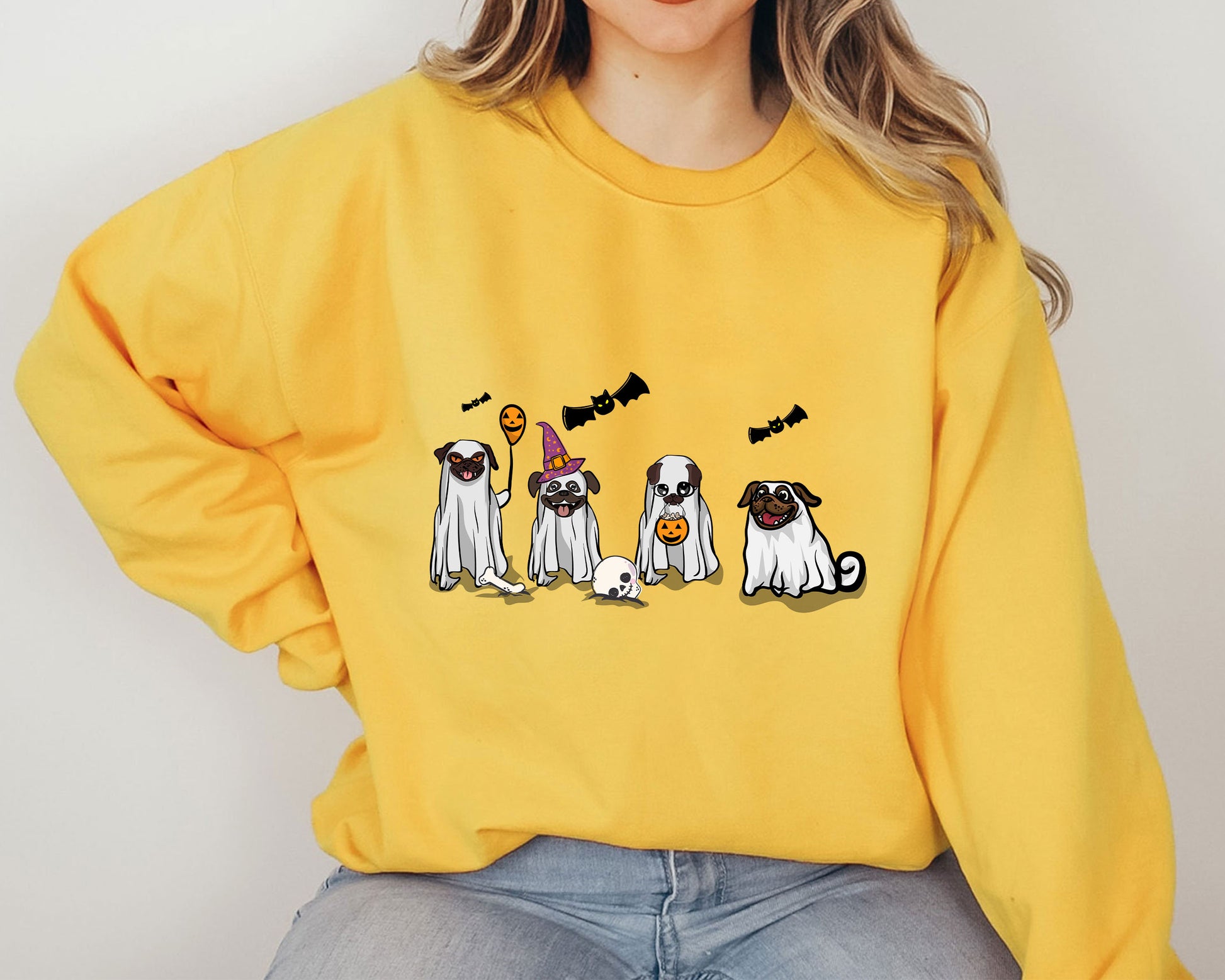 Get spooky with this adorable Pug ghost sweatshirt, featuring a ghostly pup holding a pumpkin! Perfect for Pug lovers and Halloween fans who adore comfy fall vibes. Made with soft Gildan fabric for all-season wear.